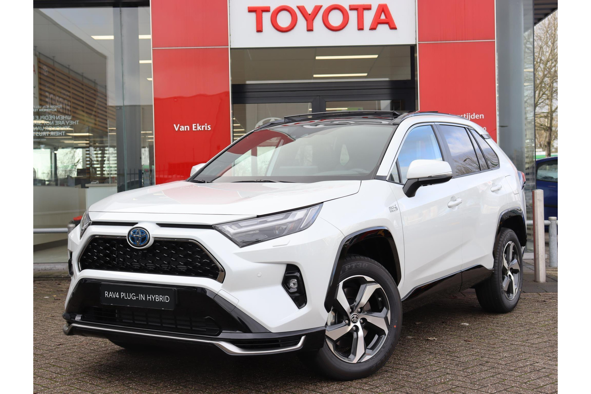 De RAV4 in d ekleur Pearl White parelmoerlak uitgerust met Panoramisch schuifdak, Innovation Pack, hierdoor heeft deze RAV4 volgende luxe accessoires: