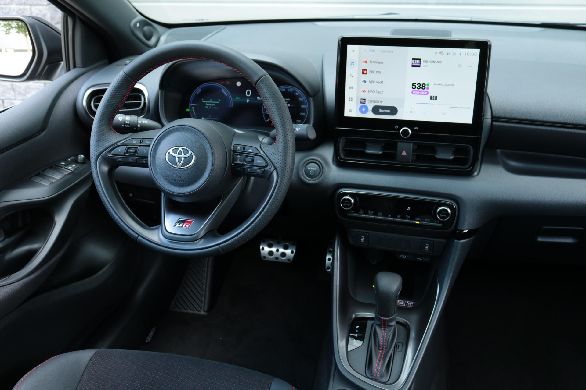 Deze super gave Toyota Yaris Hybrid 130 in de sportieve GR-Sport uitvoering. Door het mooie contrast tussen de kleur Storm Grey + Solid Black ziet de Yaris er erg strak uit! In combinatie met het GR-Sport Plus Pack zit de Yaris vol met leuke opties zoals: Panorama dak, Stoelverwarming, Stuurverwarming, Draadloos Apple Carplay & Android Auto, Parkeersensoren met remfunctie, Blind Spot Monitor, Automatisch inklapbare buitenspiegels,18 inch lichtmetalen velgen, Digitaal instrumentenpaneel, Half lederen bekleding, Donkere hemelbekleding en nog veel meer!